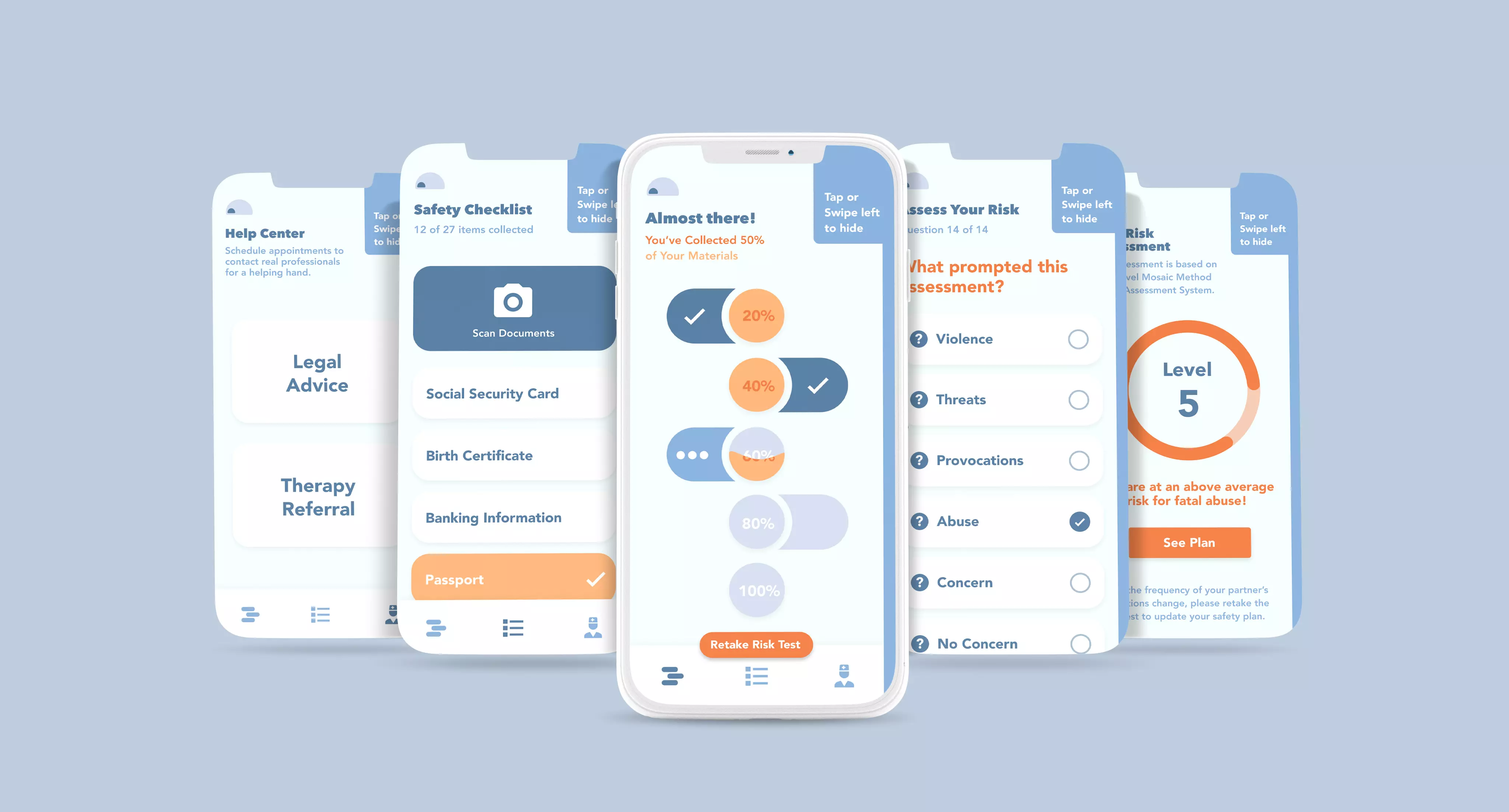 Den is here create clarity for survivers. When the user first downloads the Den alias app they will go through a risk assessment know as the Mosaic threat assessment. The Mosaic threat assessment is a certified test that assesses a combination of factors associated with risk and safety. The user is then given a score which is then used to help identify the next steps in their journey. Not everyone is in the same situation, so it is important to know what level of danger you are in so Den can appropriately help you move forward.