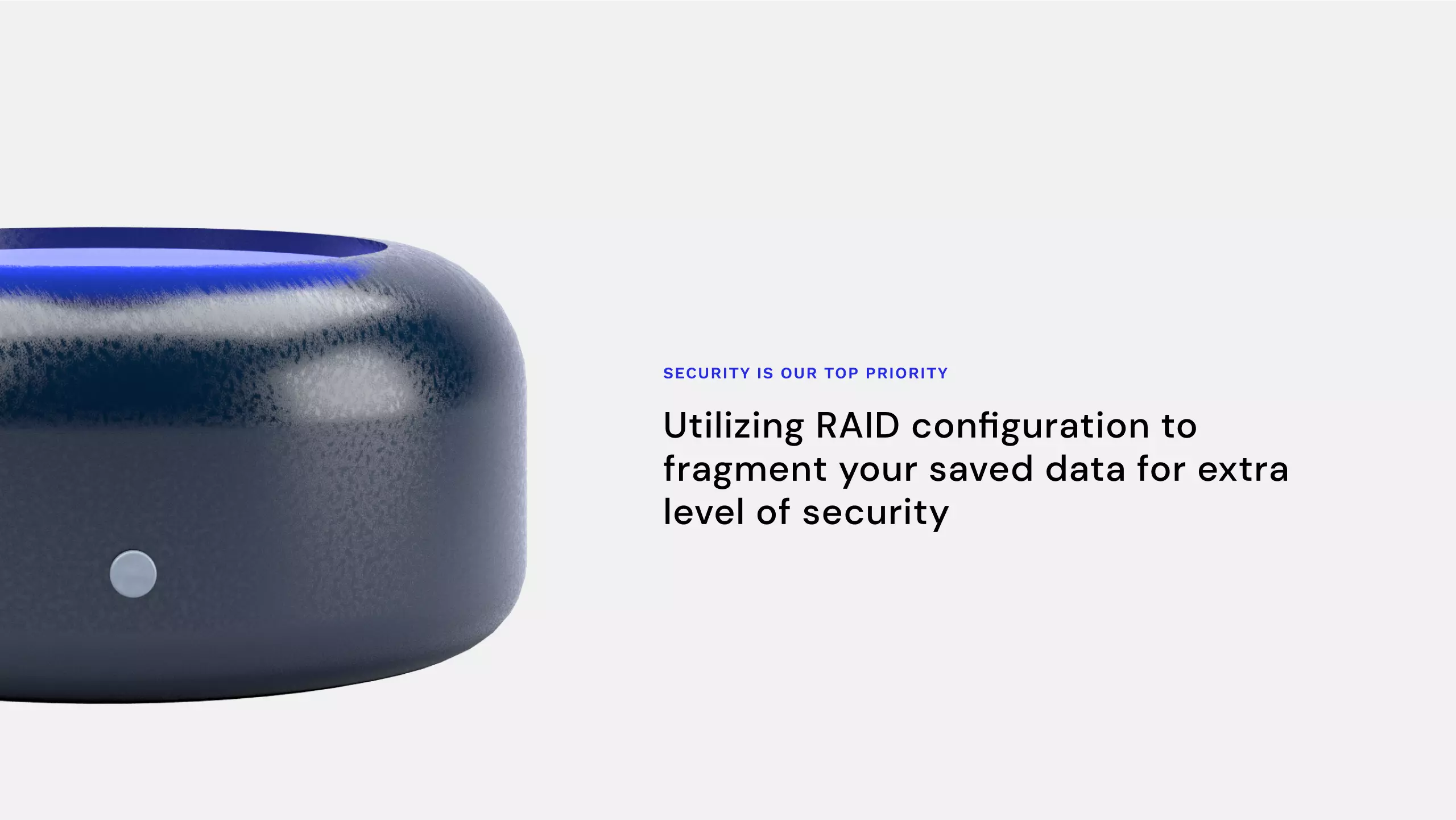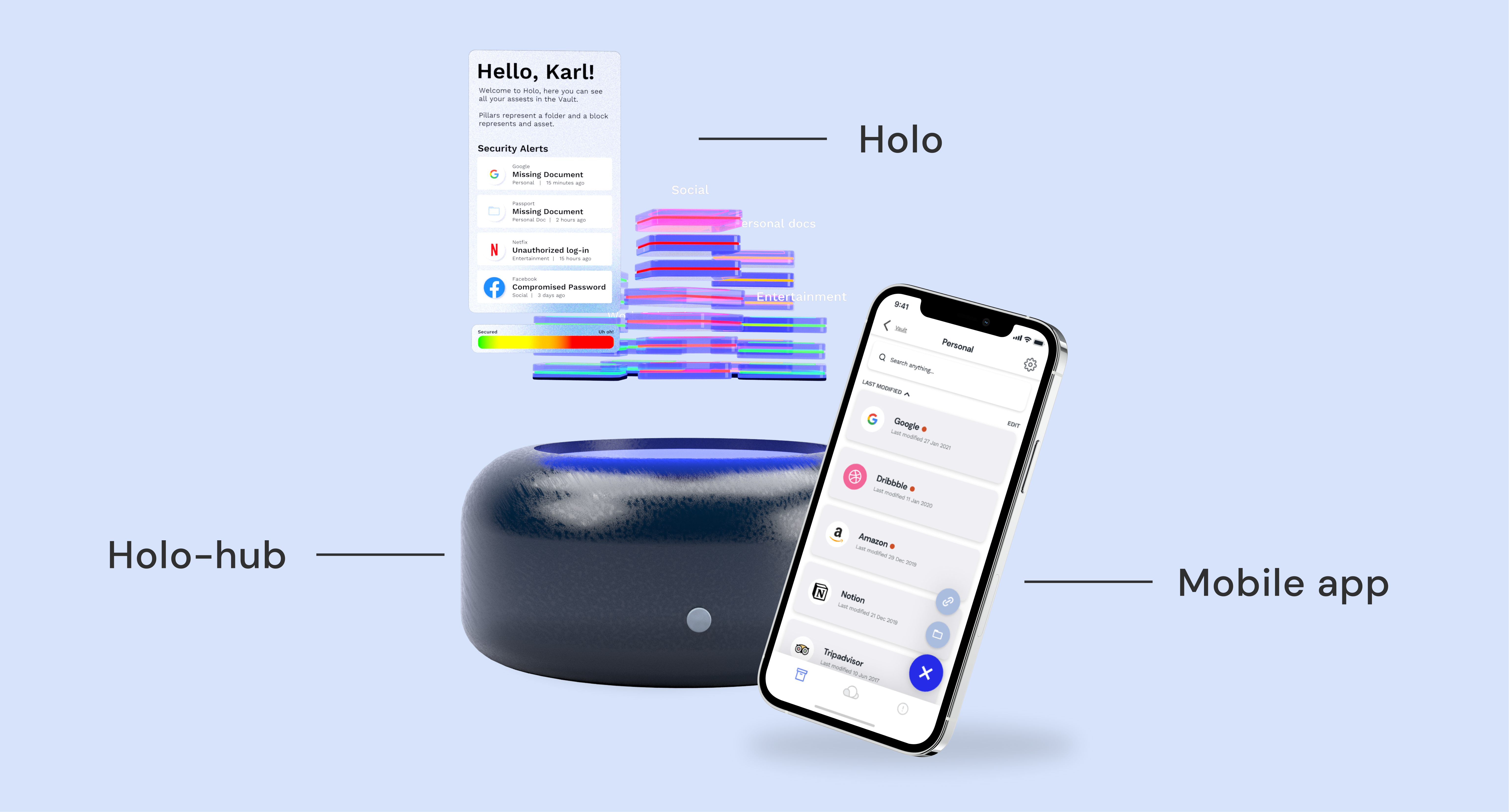 Holo, the hub that utilizes RAID configuration technology for secure data storage and hologram to help users visualize their data scripts across external and cloud-based platforms. The main hub features a hologram that illuminates from the center of the hub. Its purpose is to show users their data landscape and help them better visualize their data and where they are most vulnerable.
