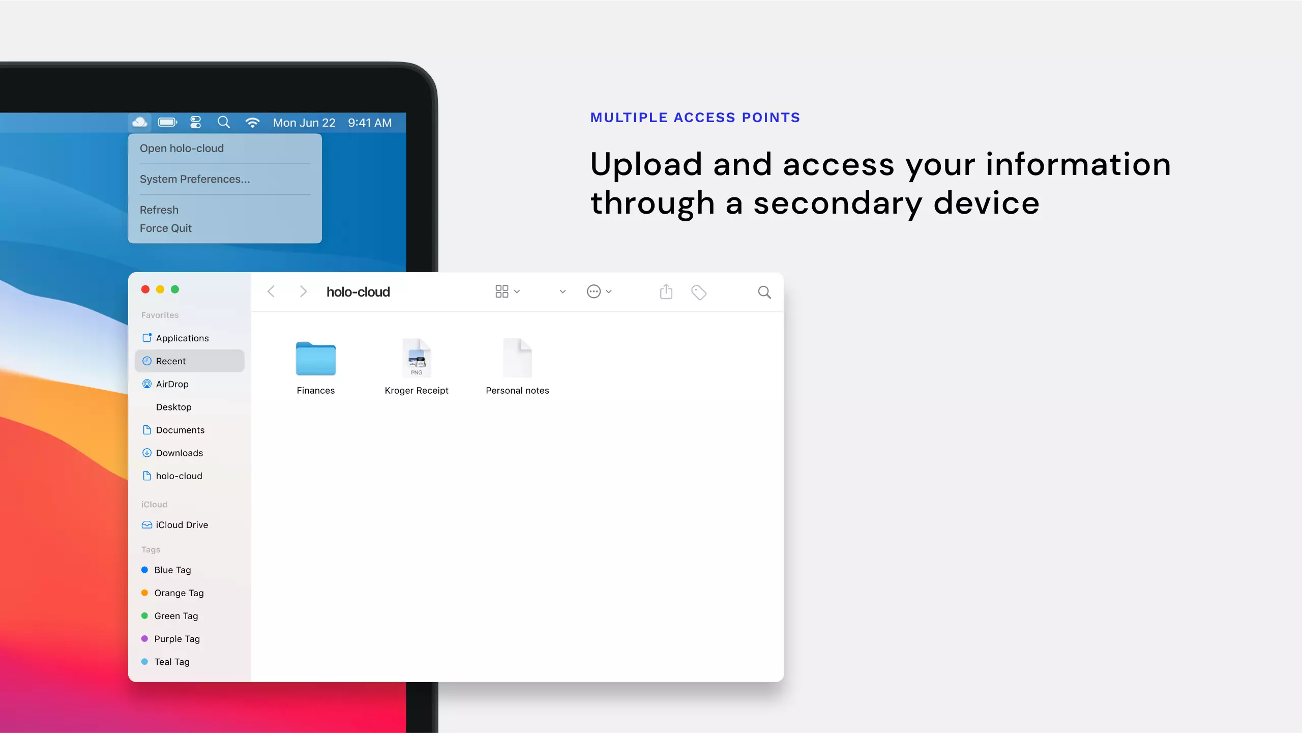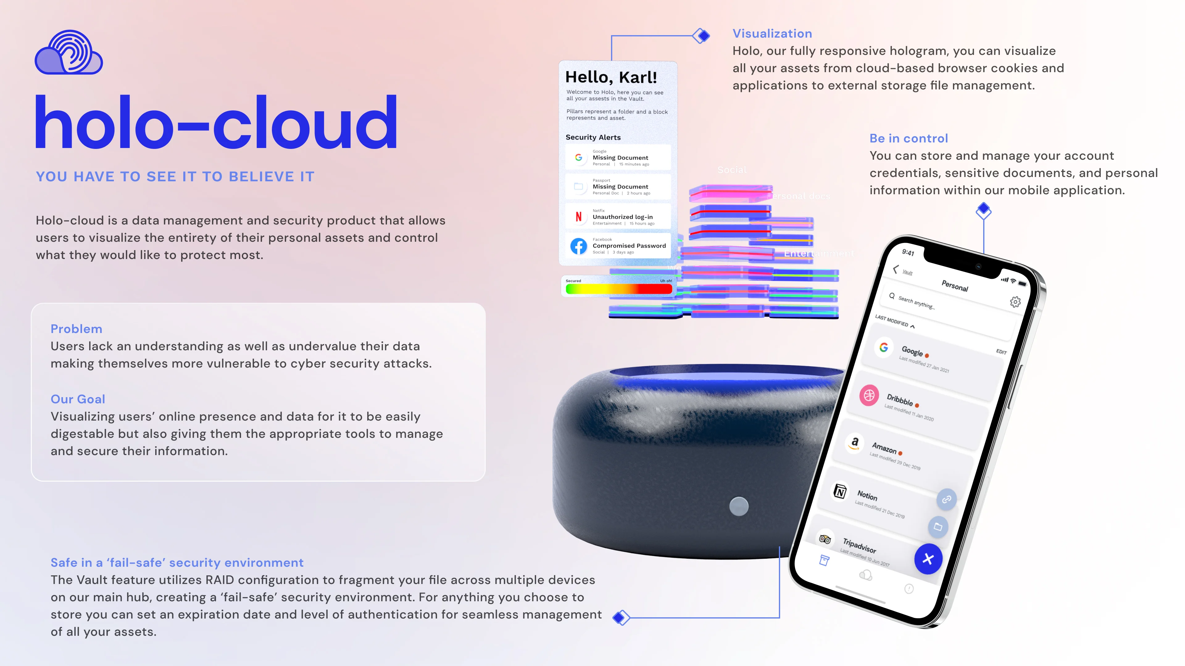 There are two aspects of Holo-cloud: the application for the uploading, accessing, and managing stored account information and documents, and Holo, the hub that utilizes RAID configuration technology for secure data storage and hologram to help users visualize their data scripts across external and cloud-based platforms.